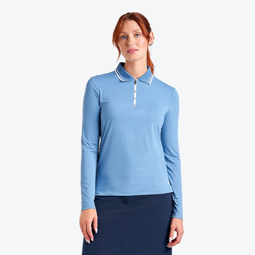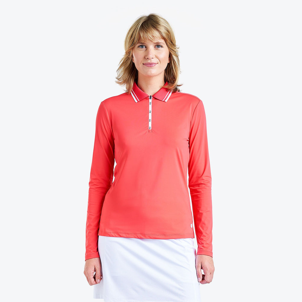 The Alana polo shirt from NVO boasts stretchiness and a soft feel, thanks to its jersey fabric, ensuring exceptional comfort. This golf polo, with its long sleeves, keeps you warm while facilitating air circulation, providing a fresh feel through its cooling, moisture· wicking, and quick· drying properties.