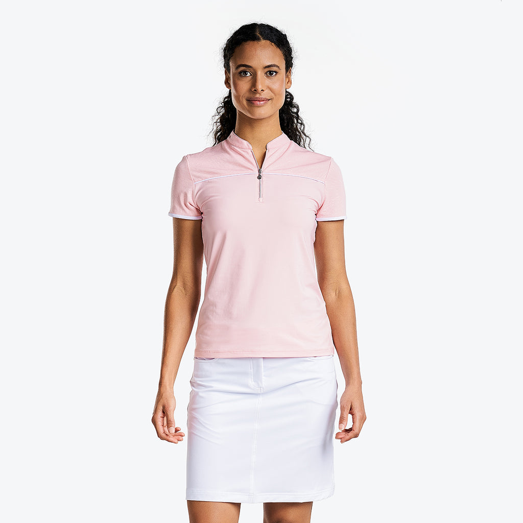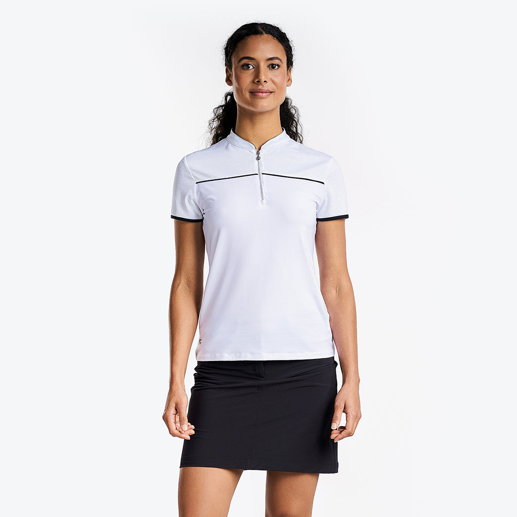 Introducing the NVO Callie mock from NVO. Built with advanced features for the modern woman golfer, the Callie mock provides sun protection to reduce the risk of exposure. Its quick-drying fabric ensures optimal breathability during your play while moisture-wicking properties help absorb sweat to keep you looking and feeling great. The lightweight Jersey fabric is stretchable allowing you to move optimally when taking your best swings. The delicate Jacquard fabric adds style and femininity. Wear the Callie to feel confident on the course.