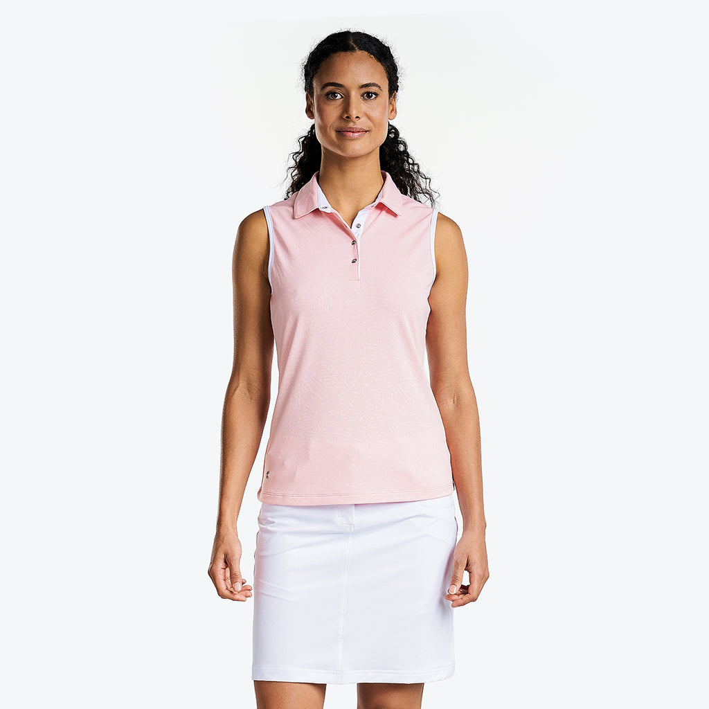 Introducing the Catrina polo from NVO, a stylish golf polo for women that makes you look and feel great on the course! Our sleeveless polo is made with delicate lightweight and durable Jacquard fabric. Perfect for days out on the golf course, this polo features UPF 30+ protection while its material is moisture-wicking for optimal comfort. Its quick-drying properties keep you fresh. To add extra comfort, we've included a 4-snap button closure. Get ready to hit your shots confidently wearing the Catrina polo combining feminine style with athletic performance like never before!