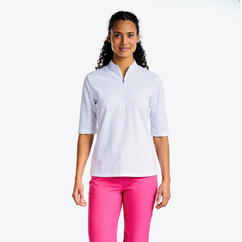 - Quarter zip with quarter-length sleeves and piqué texture for more coolness